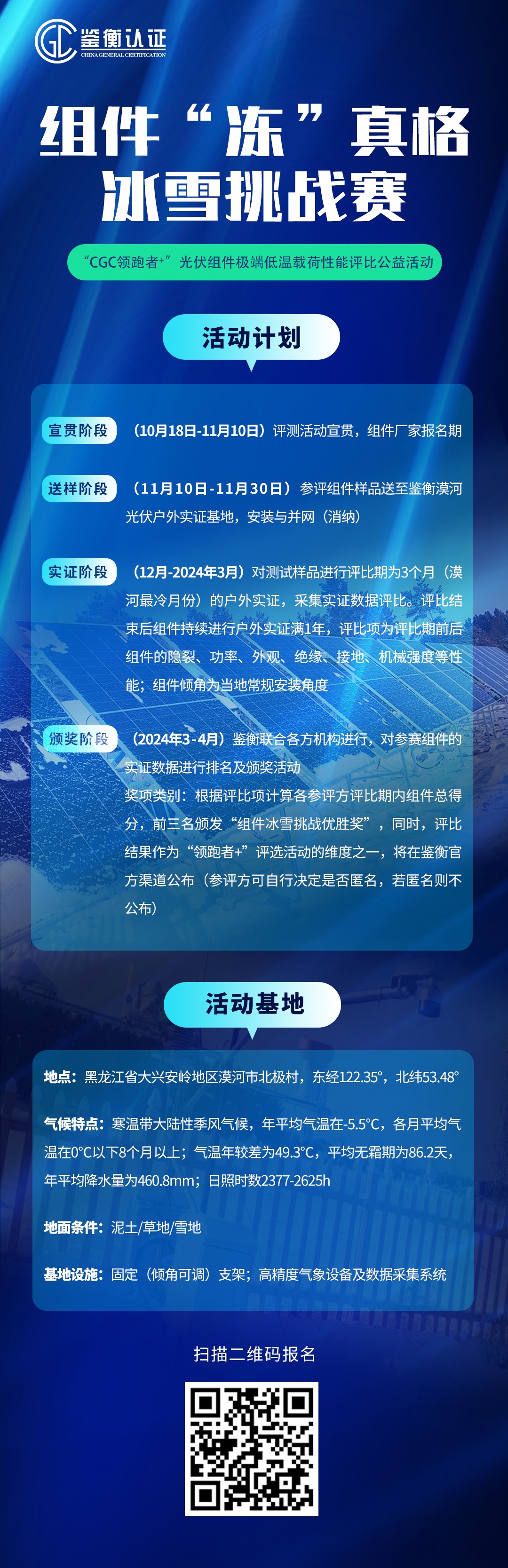 “组件‘冻’真格 冰雪挑战赛”是一项光伏组件极端低温载荷性能评比活动,也是“CGC领跑者+”体系的评测维度之一,后期数据结果都将在鉴衡官方平台上得以呈现。